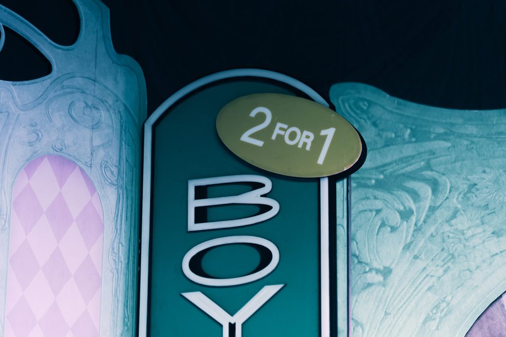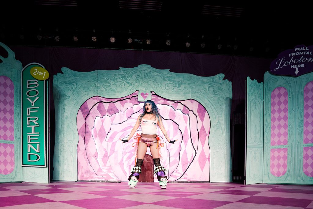 The stage production was playful and theatrical, with golden shells lining the front of the stage, a checkered pink floor, and a pink and seafoam green set. One sign read “2 for 1 Boyfriend,” while another read “Full Frontal Lobotomy Here.”