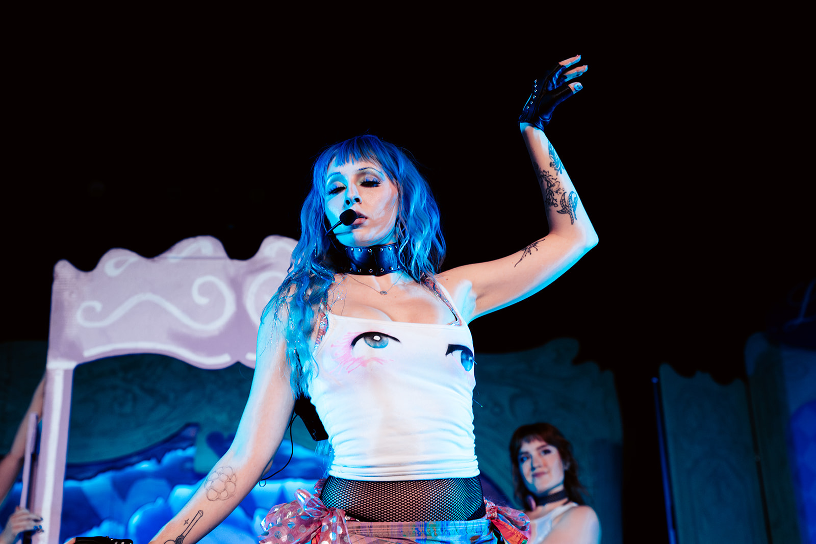 Ashnikko’s outfit matched that energy perfectly: custom boots giving off Mad Hatter-meets-Jinx-from-Arcane vibes, her iconic blue hair, layered tights, a white tank with blue eyes printed on it, black fingerless leather gloves, and a tiny skirt held together with ribbons at her hips.