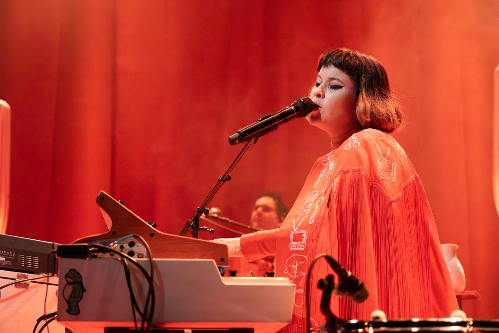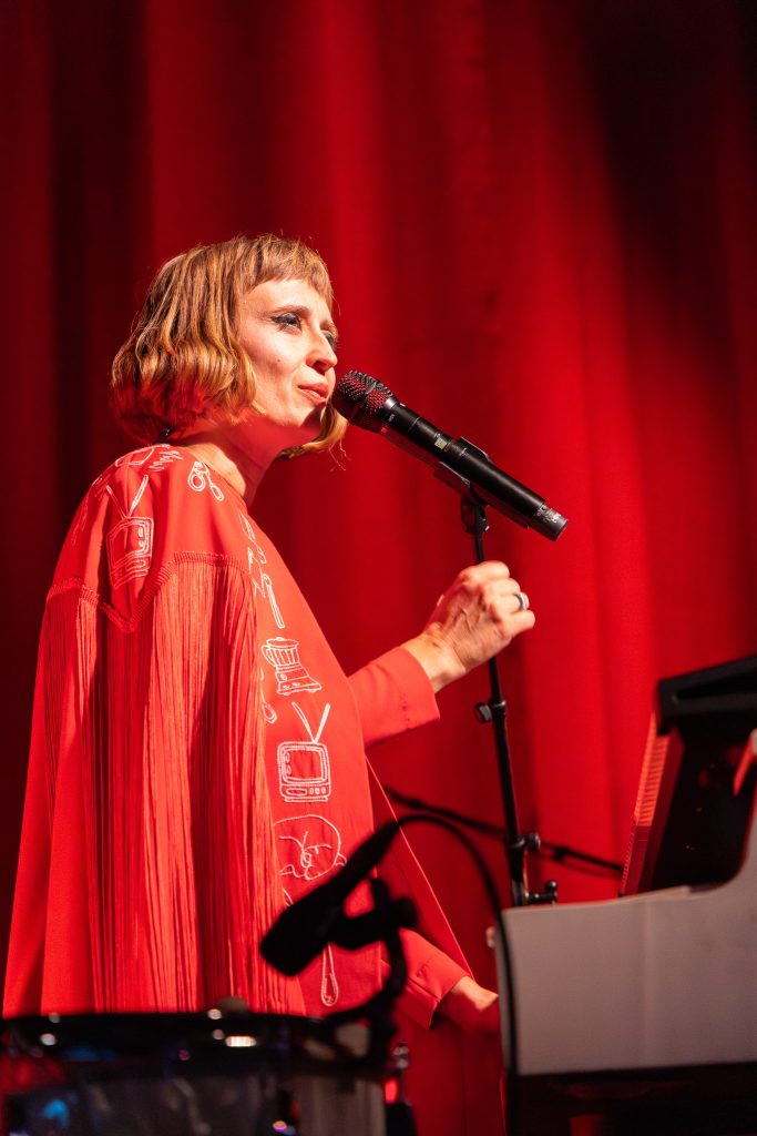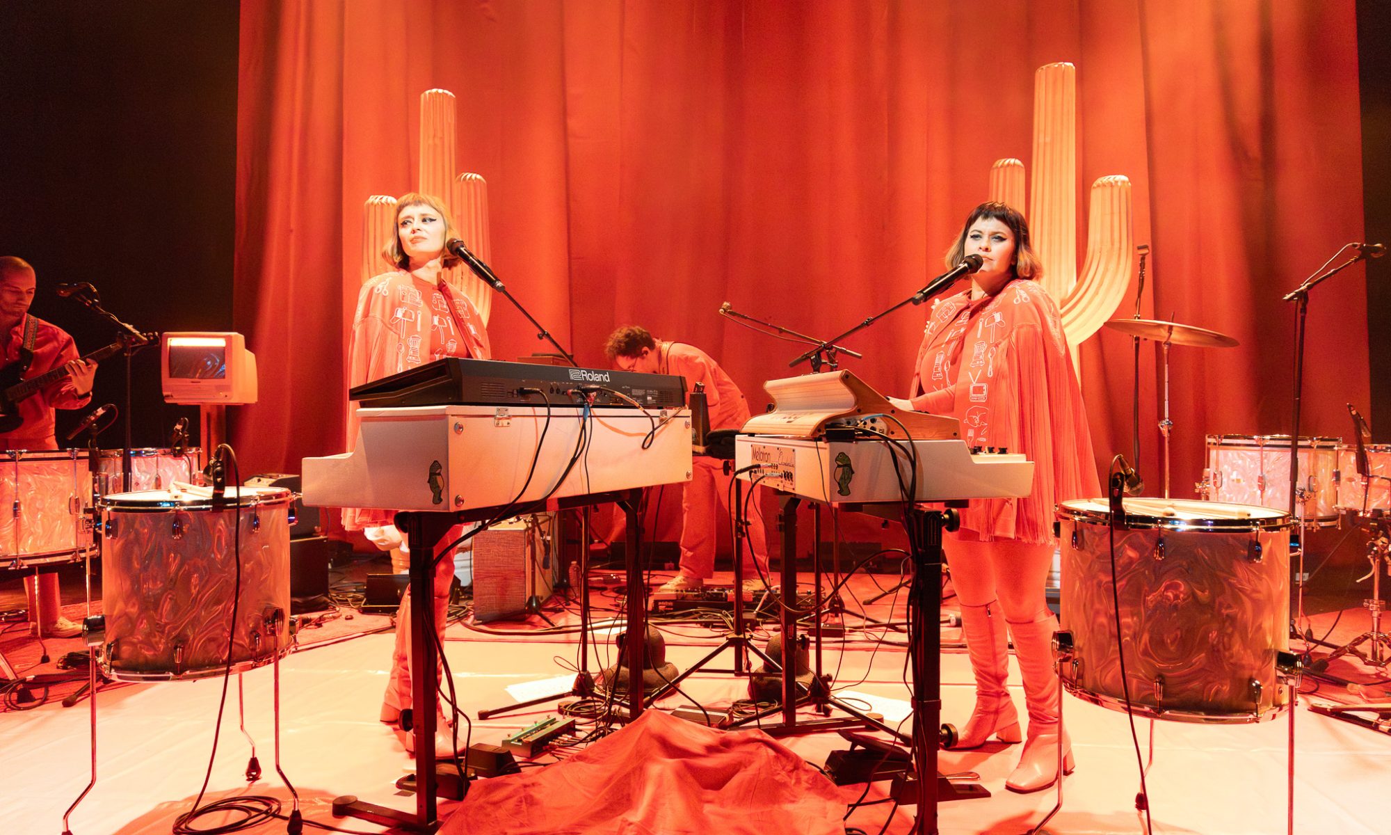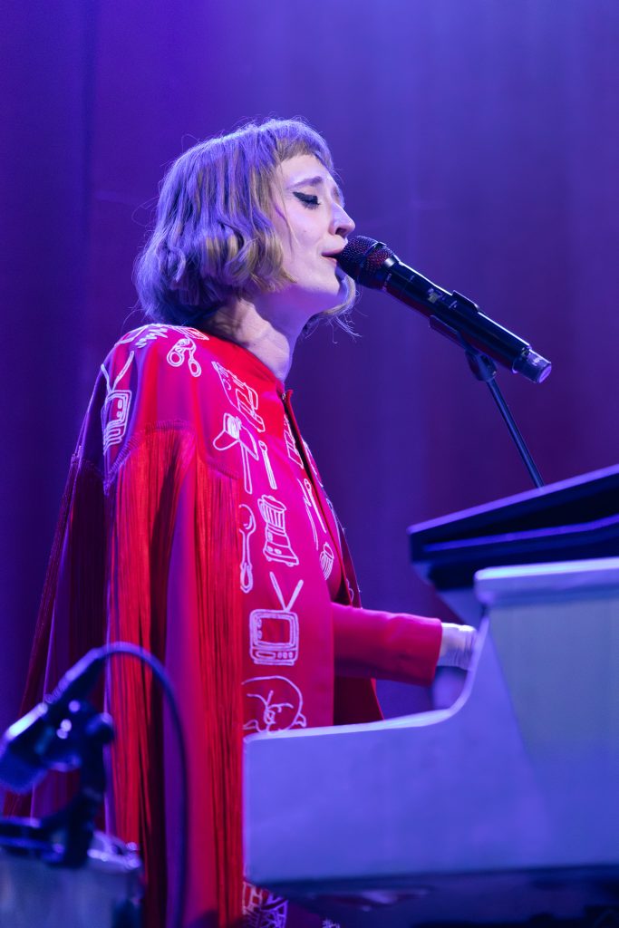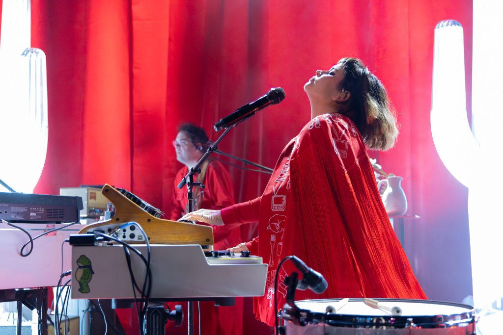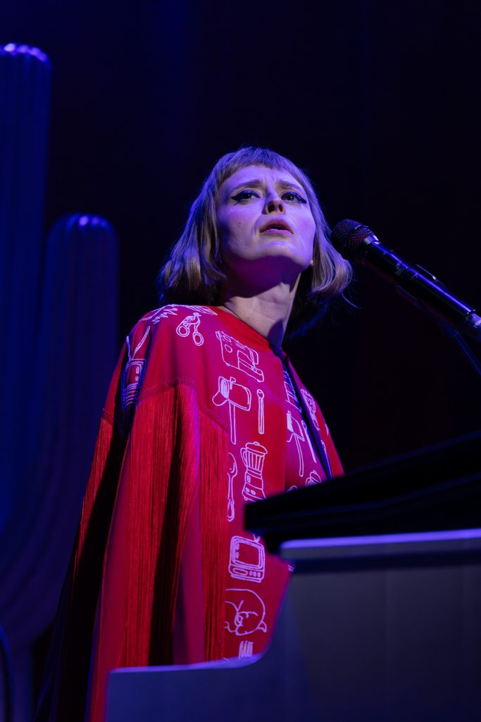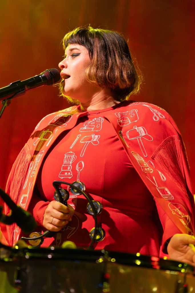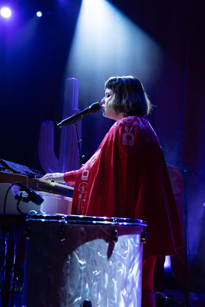Lucius leads, Jess Wolfe, and Holly Laessig came out in matching red jumpsuits with decorations from around the stage embroidered onto the outfits. Details included lamps, mailboxes, and the TV on stage; it was a super cute way to add another layer to the show.