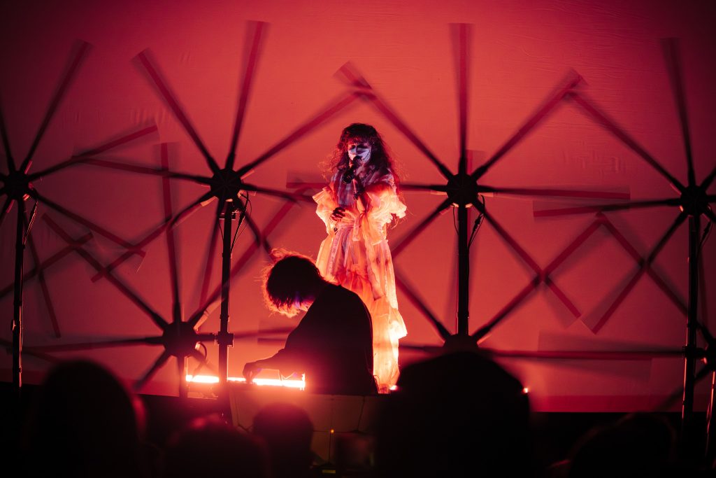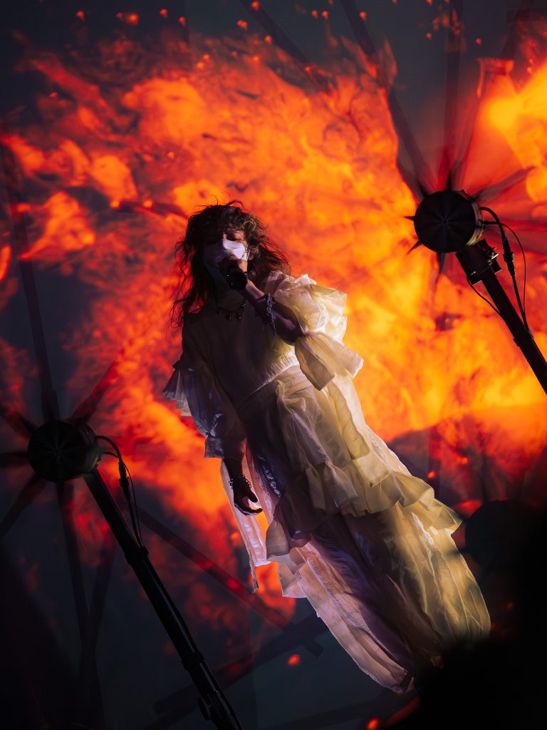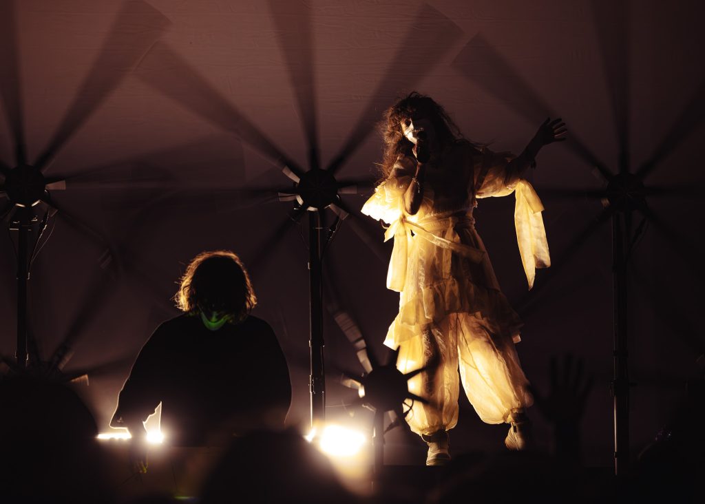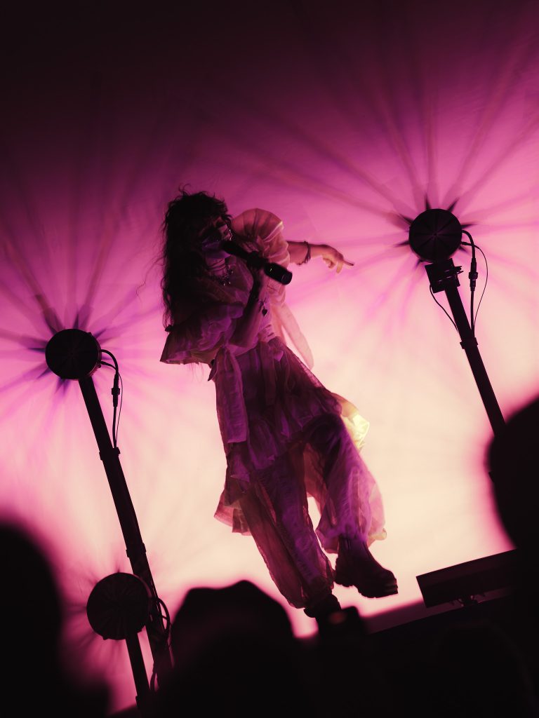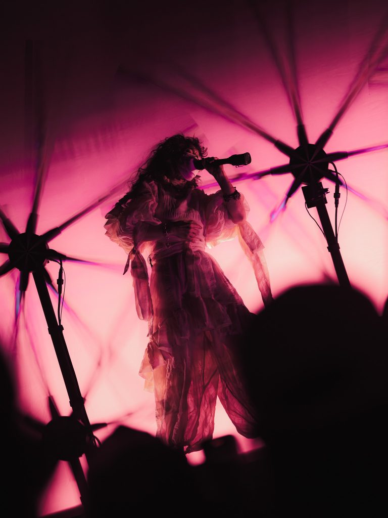 There was also a screen in the back that lit up with various mystical visuals. The duo was frequently shadowed by all of this light, but throughout the songs, the lights would silhouette them or light them enough that I could capture. Megan wore a stunning, flowy, and poofy jumpsuit with ribbons and lace, and her hair was long and curly. She, and the whole production reminded me a lot of Magdalena Bay. After seeing their show, I’m sure Purity Ring was a huge inspiration for them!
