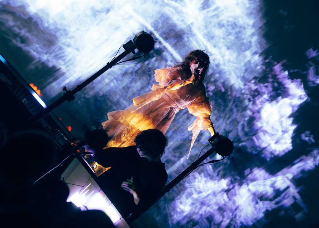 The intro to Purity Ring’s show had the room in high anticipation! Mystical ambience filled the room and started to build as the lights dimmed. This went on for several minutes as the duo prepared to take the stage. The room was cheering as the music started to swell even more. Lights flickered, and the pair walked on stage.