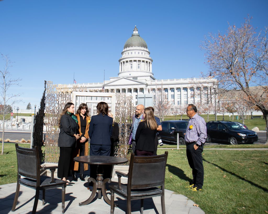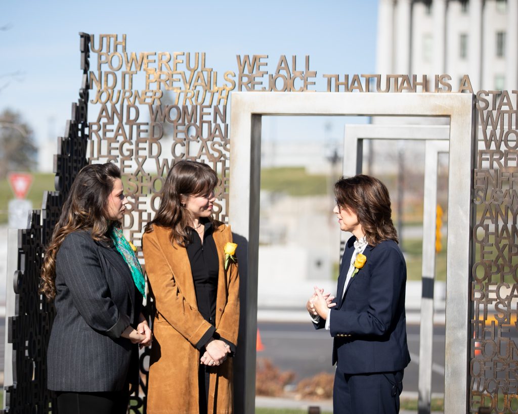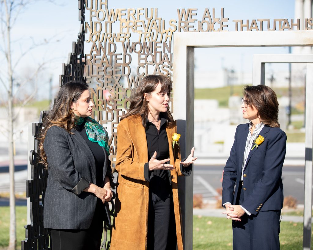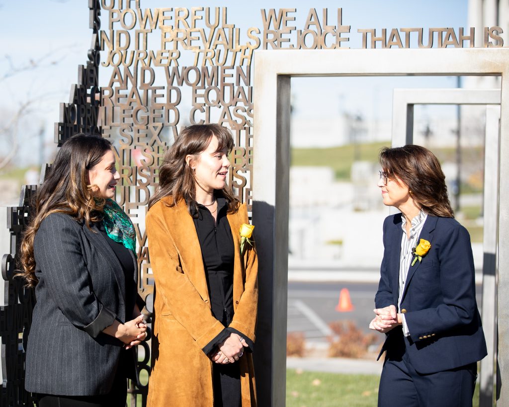 On November 13th, I had the opportunity to attend an event at the monument at the State Capitol. Utah Lieutenant Governor Deidre Henderson welcomed cast members Maya Keheher and Monica Tulia Ramirez to the Capitol grounds. Henderson shared with the cast members some women’s history in Utah. Including that Utah women were the first in the United States to vote under an equal suffrage law. She told them about Seraph Young, the first to cast her ballot in Salt Lake City on February 14, 1870.