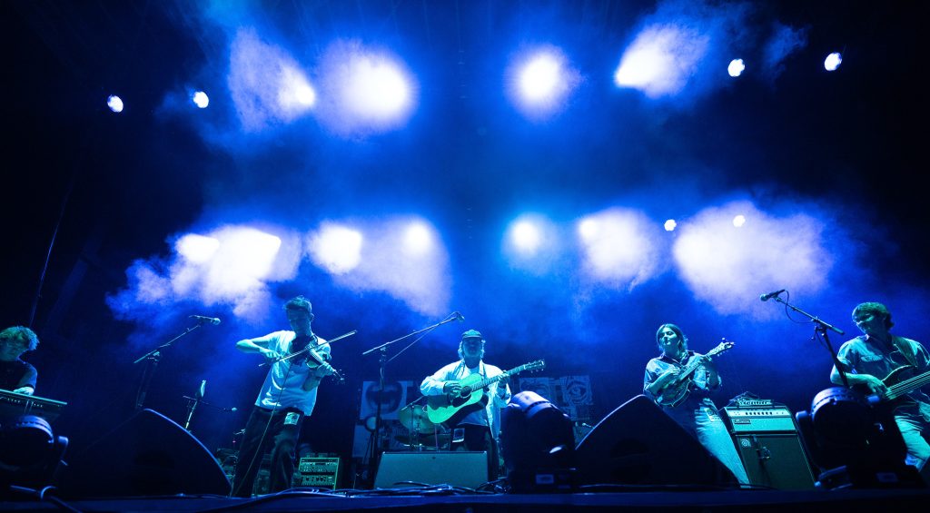 Theoretical Blonde followed and started to adjust the temperature of the space immediately. The group, known around Utah for blending bluegrass, folk, and indie tones, brought a more complex and dynamic sound. Fiddle, guitar, and keys intertwined, and the rhythm section added a pulse that felt alive. Their songs carried both the looseness of a casual jam session and the precision of practiced musicianship. One minute, they were weaving harmonies so tight you could barely tell who was leading; the next, they were exploding into layered crescendos that had the crowd moving. The wind off the lake picked up during their last song, sweeping across the field as they finished on a long, reverberating note that hung in the air just long enough to feel intentional.